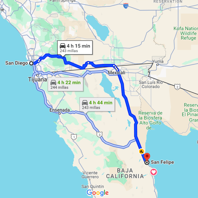 Para llegar a San Felipe desde San Diego California o Tijuana son aproximadamente 4 horas en automóvil y desde Calexico California o Mexicali son aproximadamente 2 horas 30 minutos. La recomendación para recorrer estas carreteras, al menos del lado Mexicano es no manejar muy noche y respetar los limites de velocidad pues si sales de San Diego/Tijuana y tomas la carretera que va por Ensenada hay muchas curvas en el tramo de Ojos Negros.