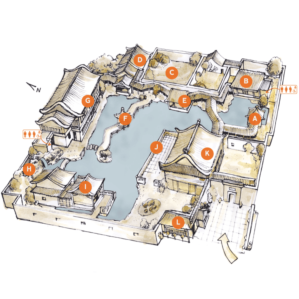 El Jardín se divide en varias zonas que puedes recorrer con total tranquilidad, ya sea que quieras tomarte tu tiempo y simplemente admirar las vistas o hacer el recorrido guiado por medio de la aplicación móvil «Discover Lan Su». Con ella puedes hacer una serie de recorridos guiados por audio, donde un pez dragón te dirá cuales son los lugares principales y te contara un poco de la historia de los jardines chinos y uno que otro dato interesante y divertido. Esta forma de hacer el recorrido por el jardín es ideal para quienes lo visitan por primera vez.