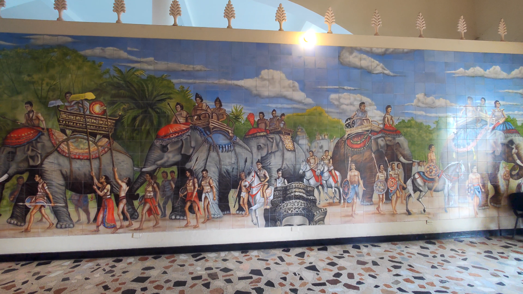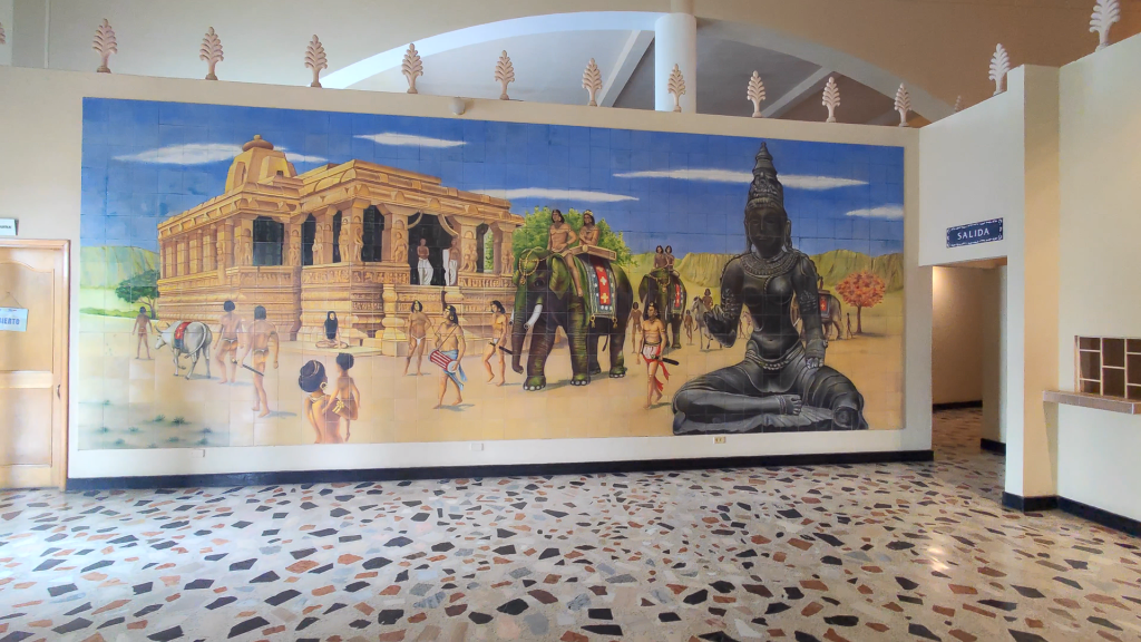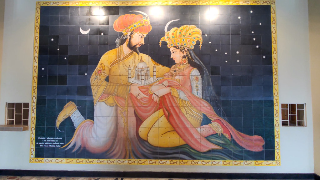 En lugar de las tumbas, justo en la entrada tenemos este enorme mural con la imagen del emperador y su esposa sosteniendo el Taj Mahal en sus manos. Además de otros murales que representan aspectos importantes de la cultura india.
